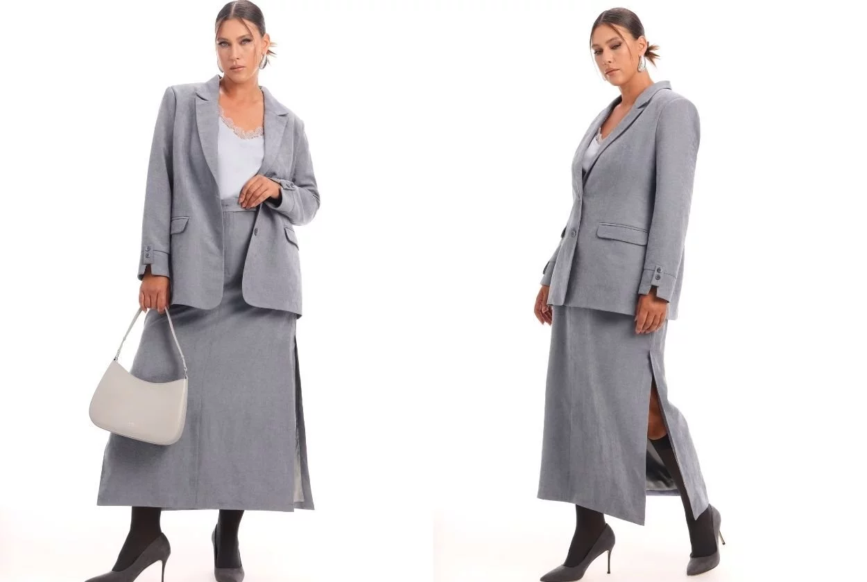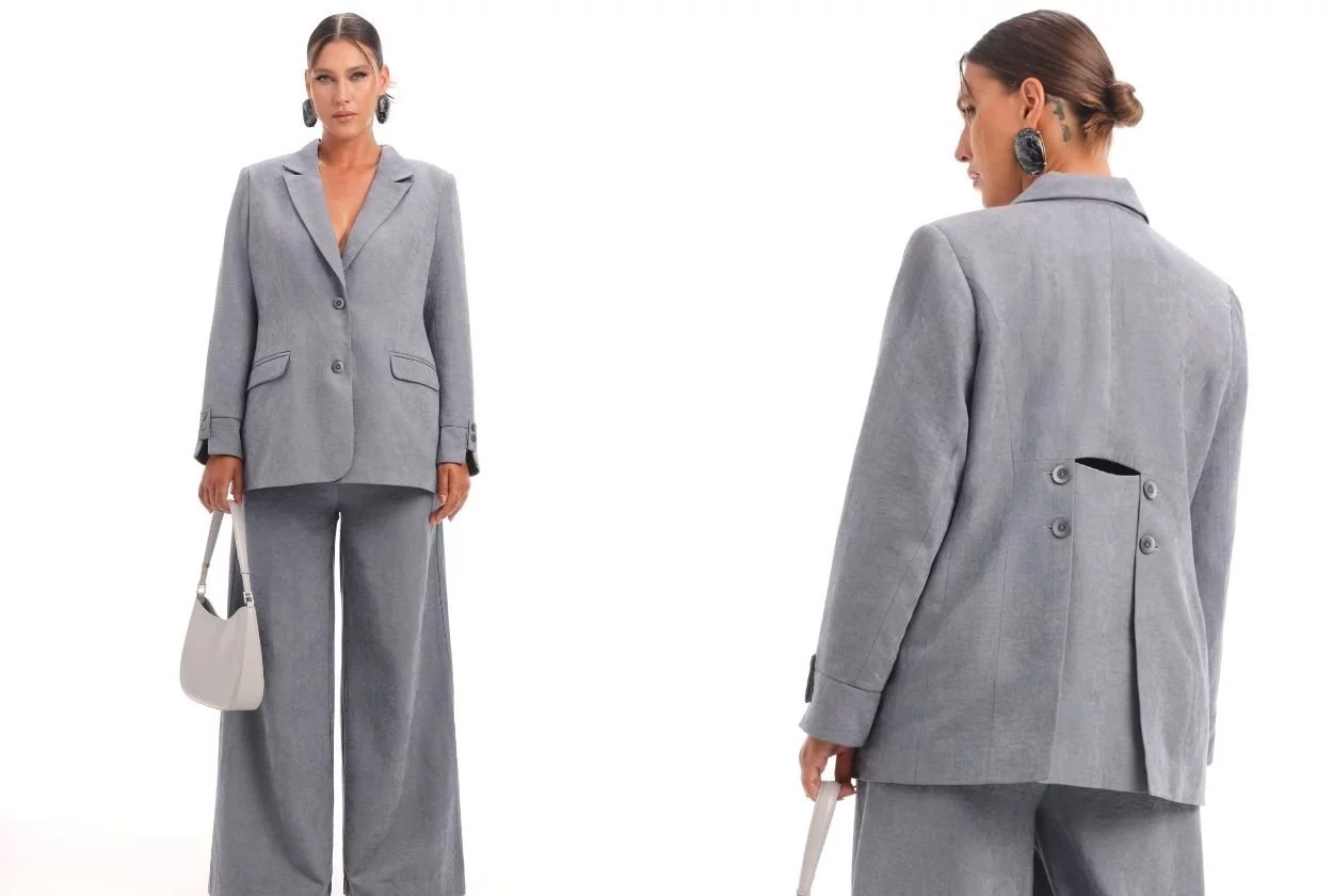 Серый пиджак — это преемник классического черного, но с более мягким и универсальным характером. Он сочетается с джинсами, платьями, брюками и даже спортивными вещами, превращая любой casual-образ в стильный и гармоничный.