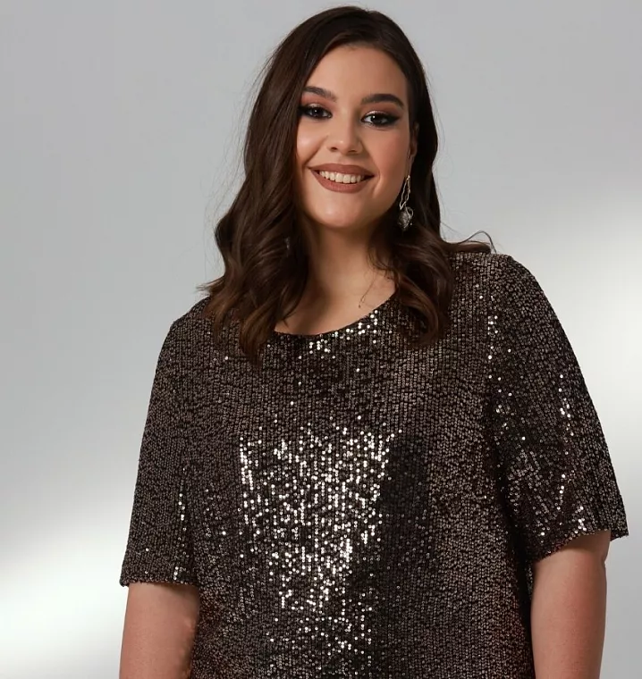 Первый праздничный образ – готовый комплект, который нужно лишь дополнить лаконичными аксессуарами. Приятная теплая гамма с медным отблеском – настоящий лук для праздника. Чтобы превратить его в более повседневный, нам понадобится однотонная блузка простого кроя или рубашка. Изделие простого фасона «успокоит» игру пайеток, cделая образ более свободным в своей подаче.