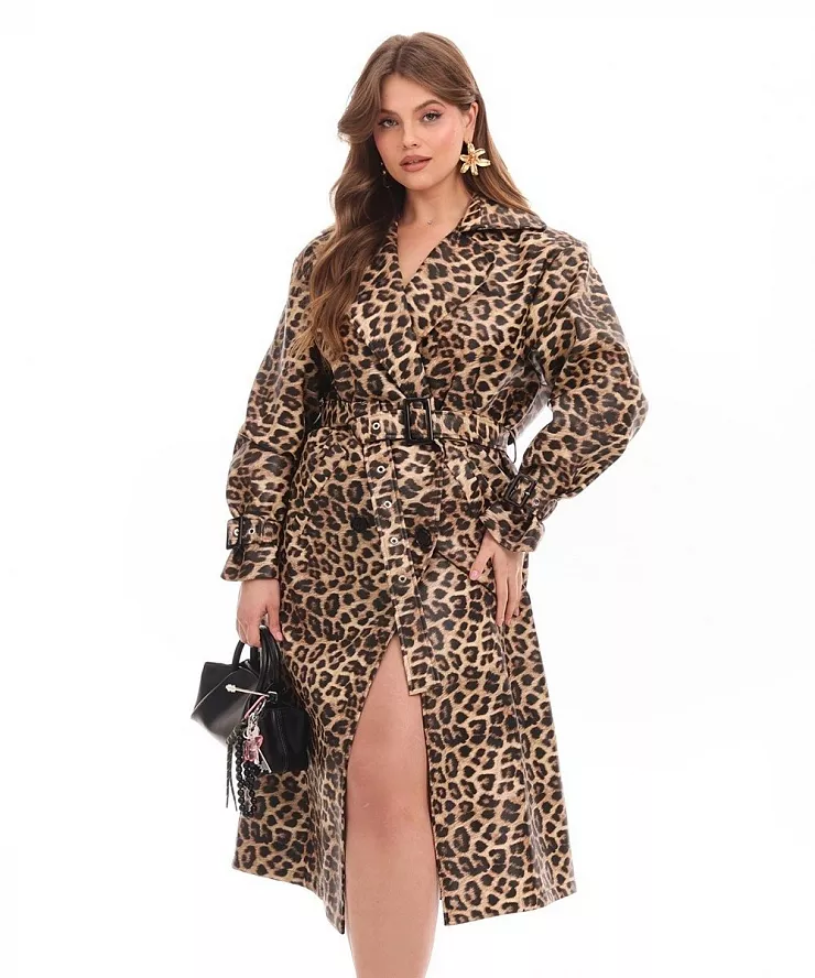 Двубортный кожаный тренч принтованный в анималистичном стиле