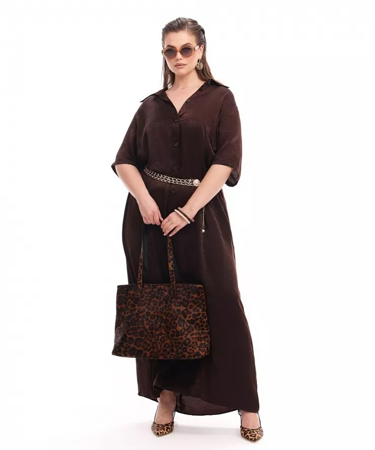 Коричневое макси платье на пуговицах с блеском