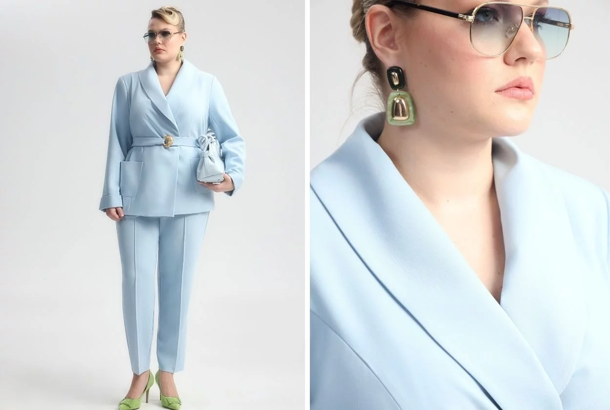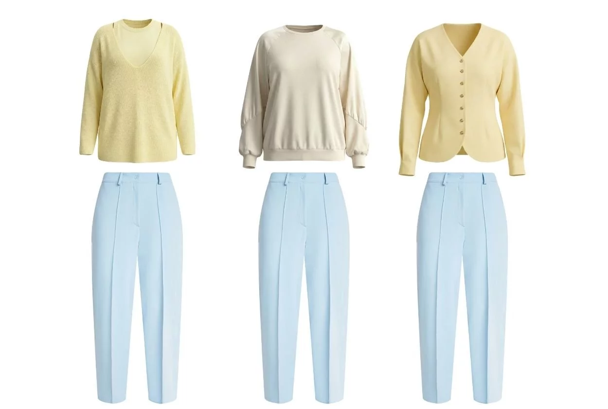 Возьмите за основу прямые брюки голубого цвета (оттенок присутствует в каждом весеннем дропе, поэтому легко найдется альтернатива или дополняющая деталь), добавьте к ним лимонный джемпер (базовая, но солнечная вещь) или жакет с акцентными рукавами. Такой лук подойдет для офиса и встреч с подругами.