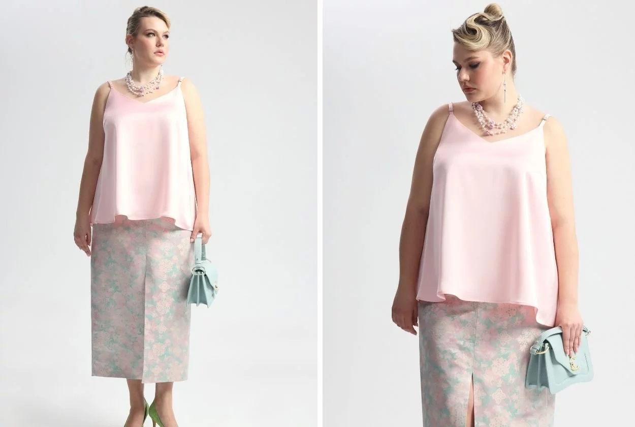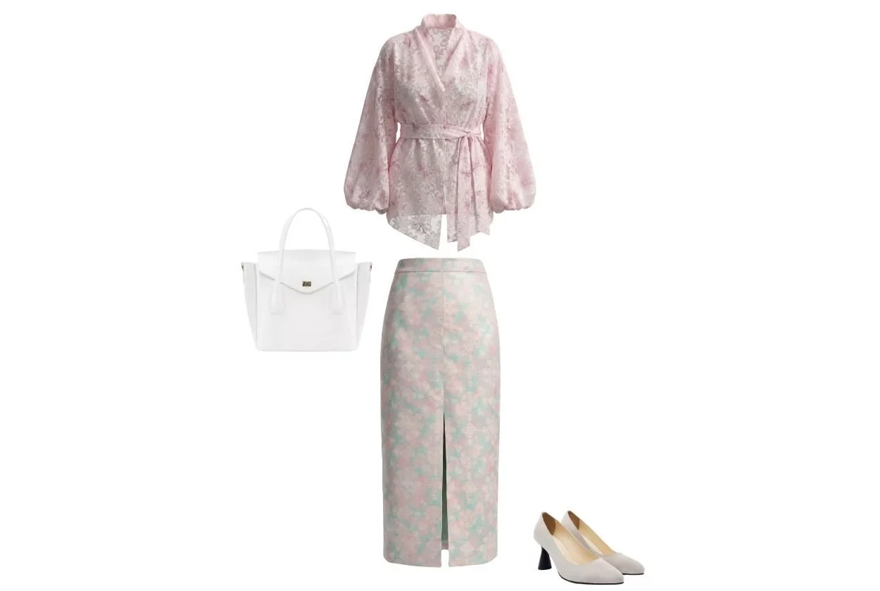 Одним из самых красивых луков и модных вызовов сезона является total-look в пудрово-розовом. Но чтобы не выглядеть "приторным пирожным" или молодящейся "зефиркой", добавьте текстуры: кимоно из фактурной ткани с набивными цветками ткани и юбка из жаккарда. Если любите сложные сочетания, этот микс вам понравится.