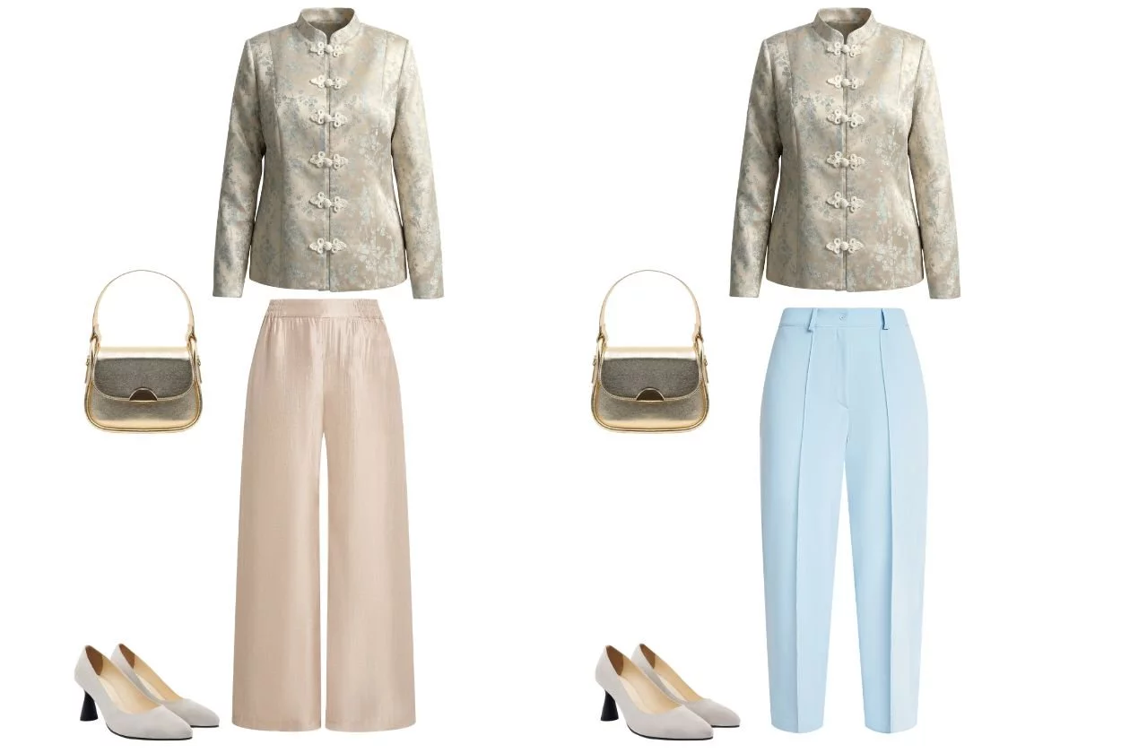 Такой атрибут верхнего гардероба становится "скелетом" образа. Его можно накинуть на невесомое платье, и вы получите идеальный баланс: когда восточная сдержанность встречает европейскую романтичность. Или обыграть прямыми однотонными брюками. Такой аутфит не нужно усложнять, сама по себе композиция с таким жакетом выглядит завершенной.