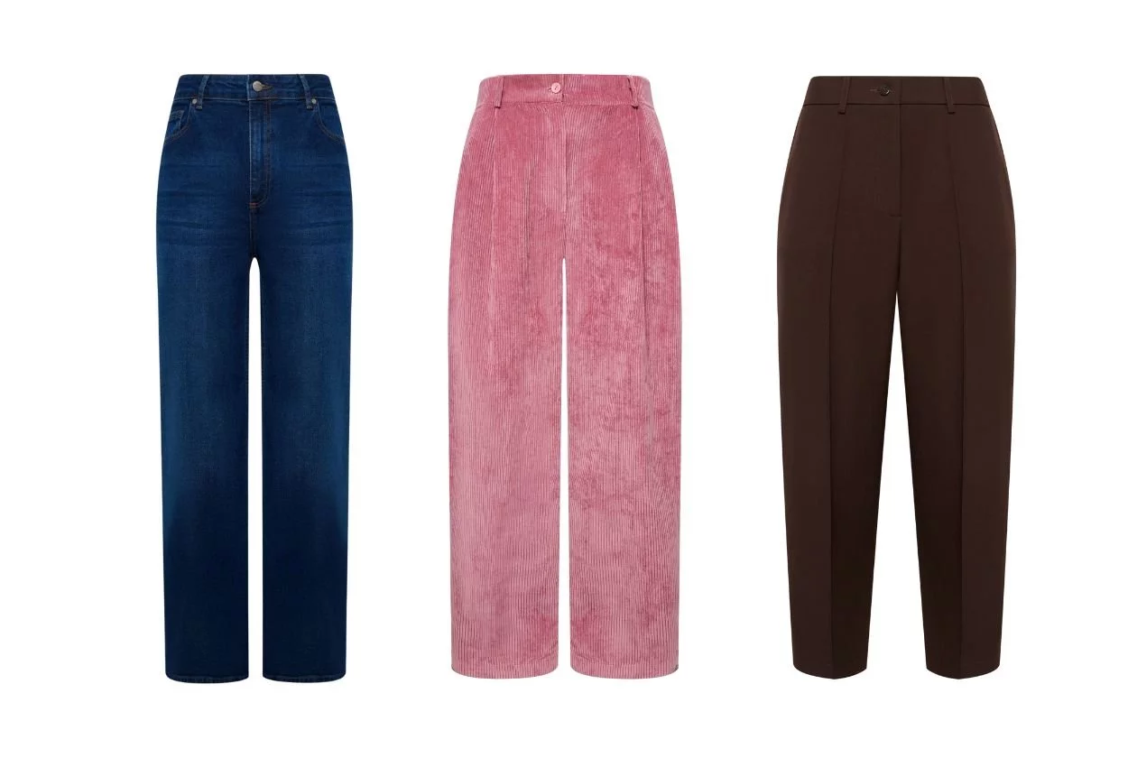 - Полная длина + «трубы», «бананы» или о-силуэт: брюки полной длины, касающиеся верха обуви, вытягивают линию ног. Попробуйте свободные модели брюк или джинсов с высокой талией — они создают идеальный вертикальный силуэт.