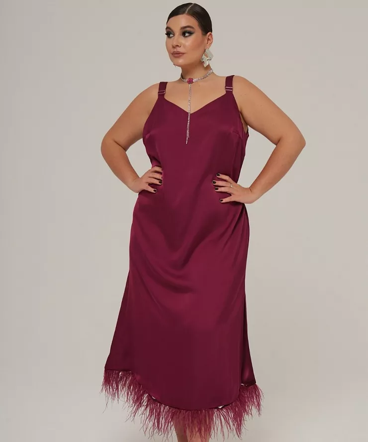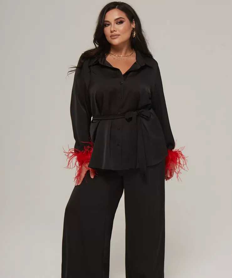 Шелковый костюм с палаццо в стиле слинки и отделкой перьями