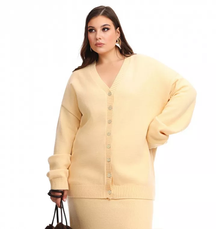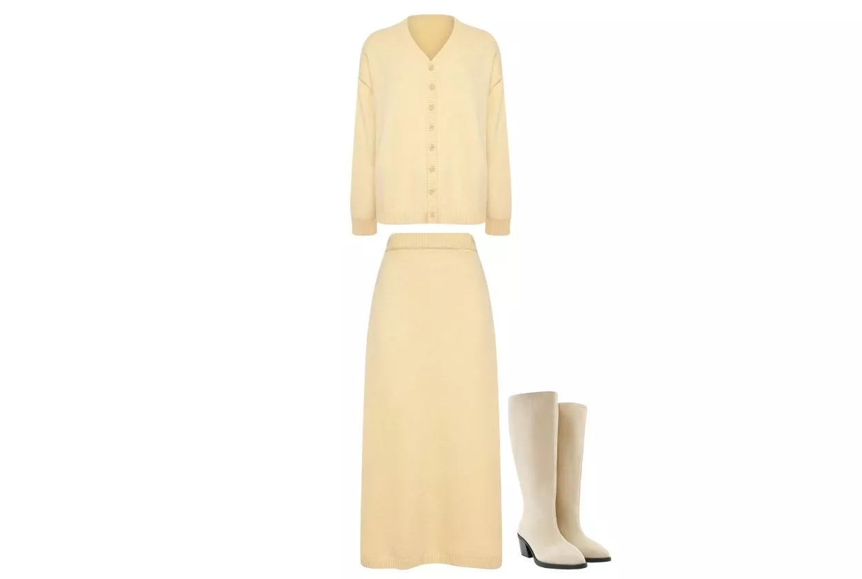- Вязаный трикотажный костюм – расслабленный кардиган с юбкой.