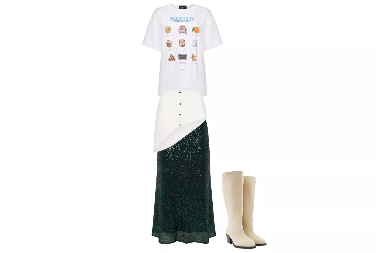 Четверг, как принято считать, — это маленькая пятница. А значит и радость от заканчивающейся недели должна быть заметной, но не такой уж явной. Юбка-миди с пайетками + футболка — стильное сочетание в духе Керри Брэдшоу. Получается элегантно и современно.