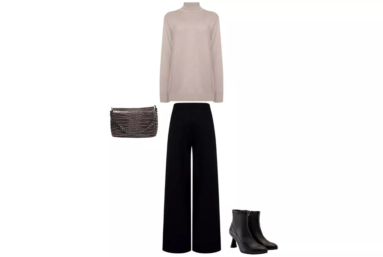 Начало недели должно быть комфортным, но и собранным. Черные брюки с водолазкой – база, которую легко дополнить аксессуарами. Получился образ делового кэжуал, который говорит: «Я готова к свершениям, трудности мне по зубам». Акцент на лаконичные украшения и удобную обувь.