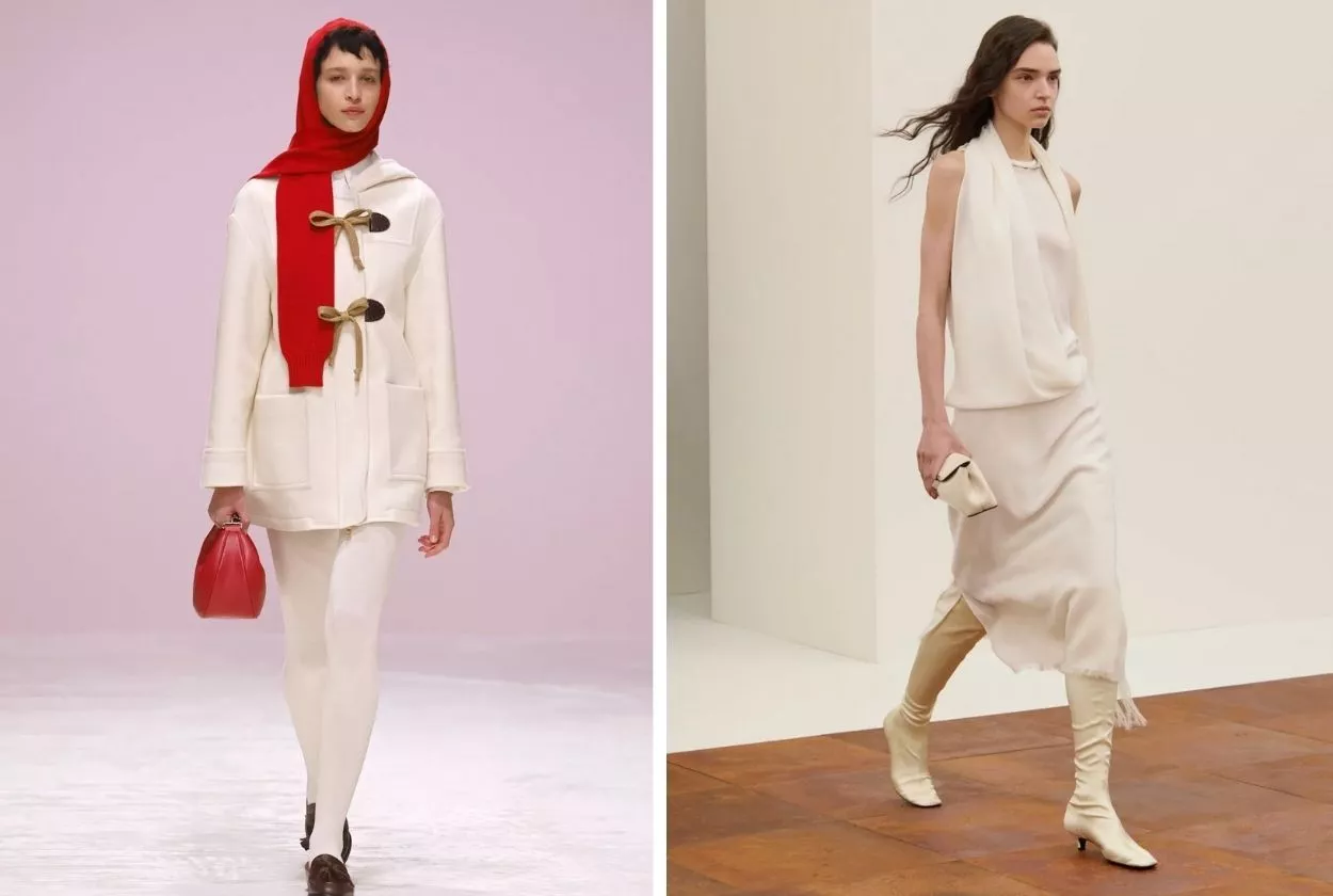 Преимущества: мягкий, воздушный, почти невесомый белый с теплым подтоном. В отличие от стерильного холодного белого, молочный — более нежный и уютный. Он добавляет образу света и воздушности, не перегружая его. Этот цвет визуально смягчает черты, создает ауру спокойствия и чистоты.