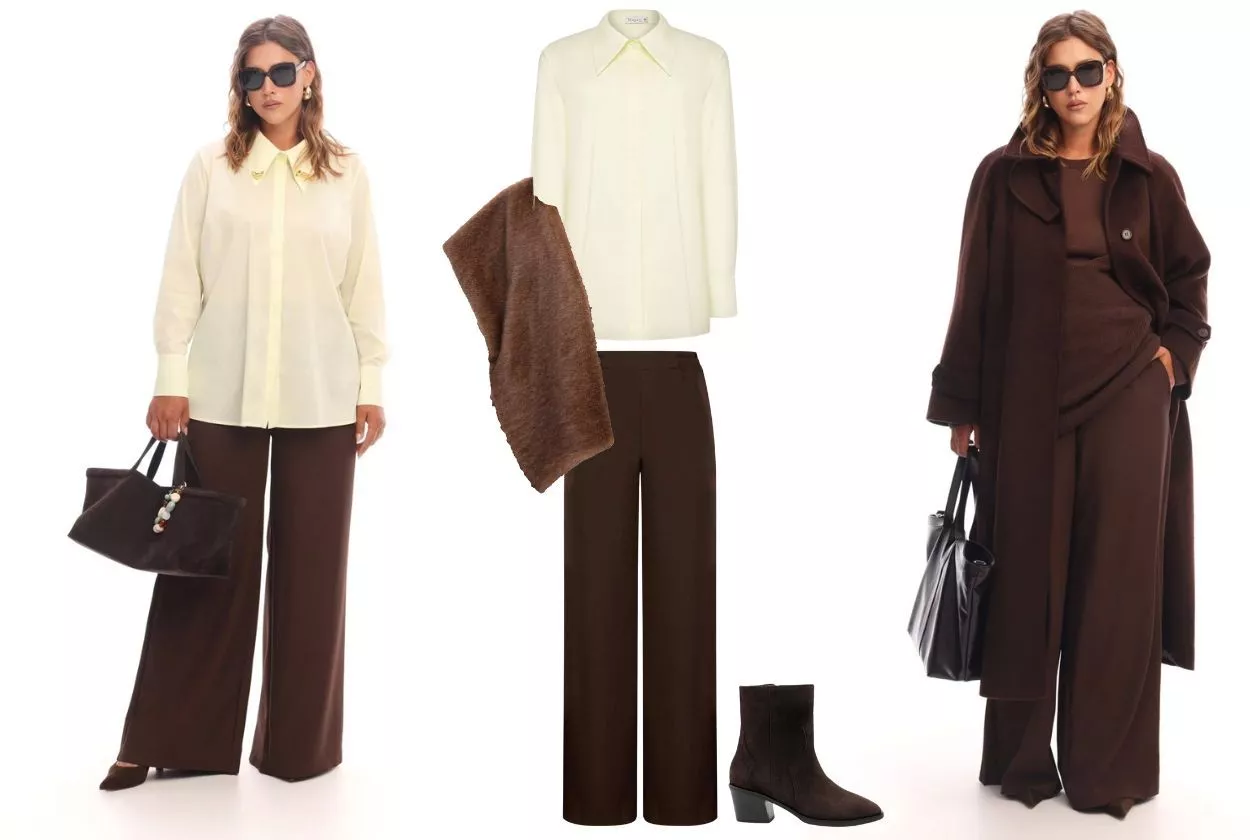 Можно шоколад оттенить сливочно-желтым оттенком в виде рубашки или составить тотал-лук, который легко впишется в гардероб и подстроится под погодные условия. Шоколадные палаццо + свитер в дуэте с трикотажным топом + пальто — идеальный вариант. Аксессуары и обувь цвета горького шоколада подчеркнут глубину образа.