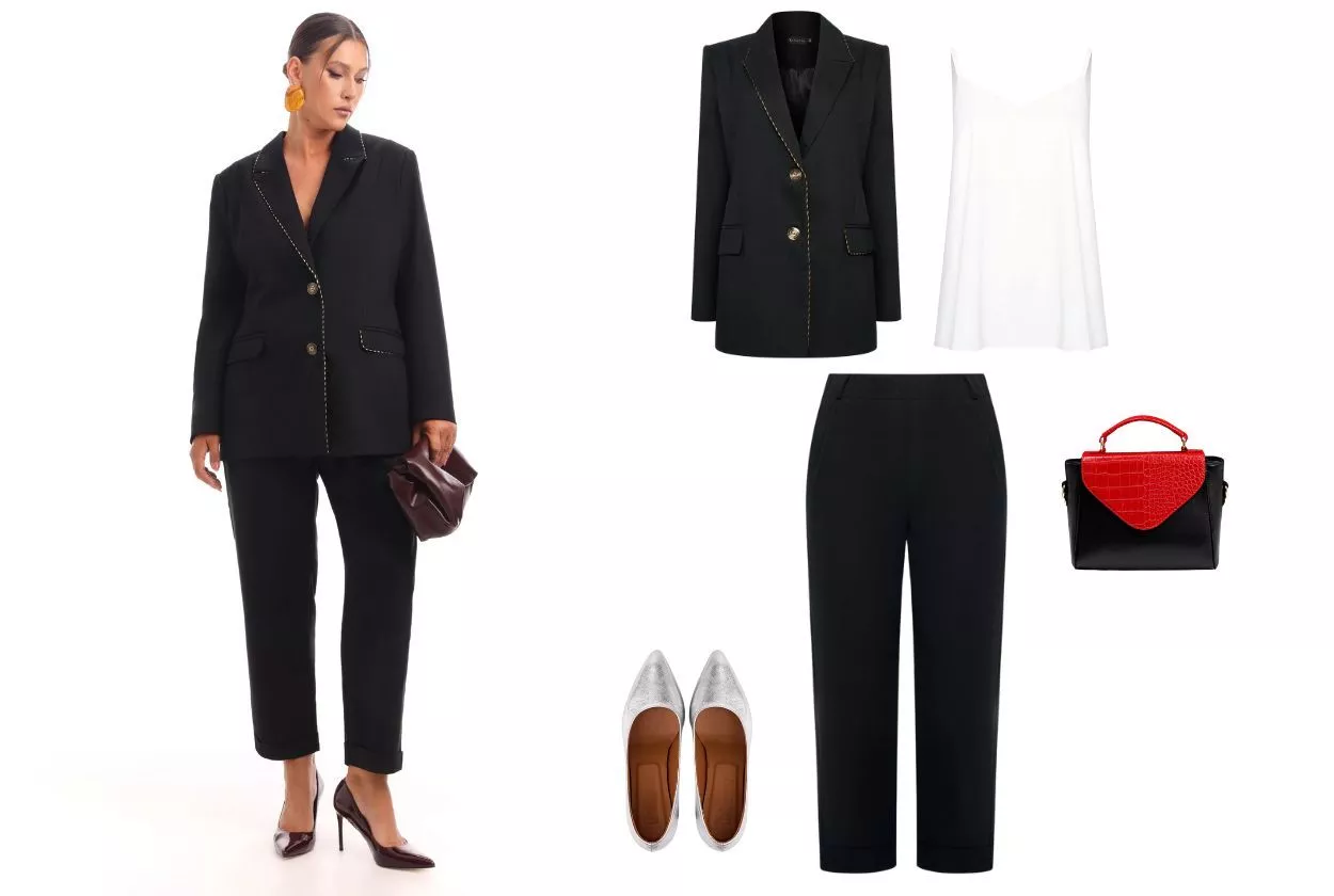 Первый образ — микс палаццо с жакетом на замке. Простой и лаконичный. Сочетайте широкие брюки палаццо с облегающей водолазкой или блузкой. Добавьте блейзер на молнии из костюмной ткани в тон брюк и обувь на устойчивом каблуке. Акцент на стильную сумку-торбу — и безупречный образ готов!