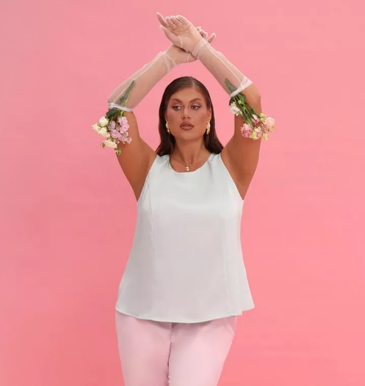 Топы и блузки: выбирайте модели с V-образным или асимметричным вырезом. Это отвлекает внимание от талии и подчеркивает декольте.