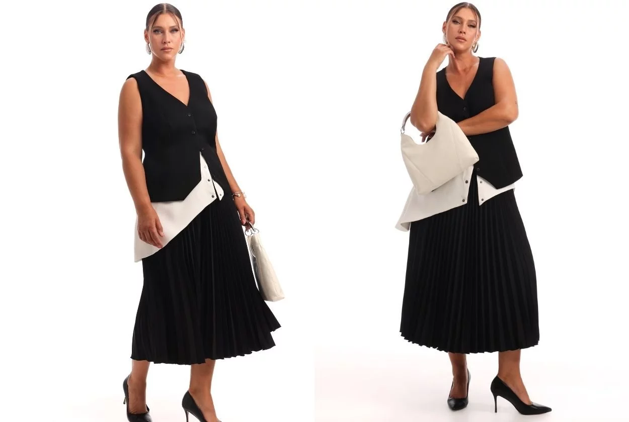 - Костюмный жилет + юбка плиссе + акцентная баска