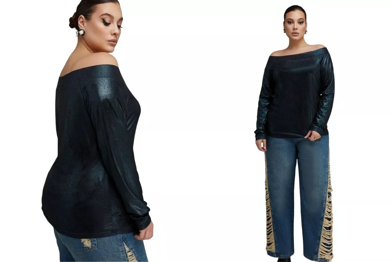Лонгслив с открытыми плечами и фольгированным эффектом