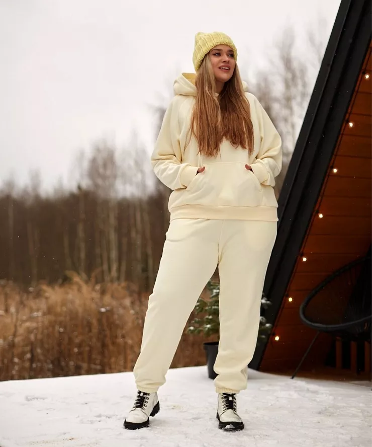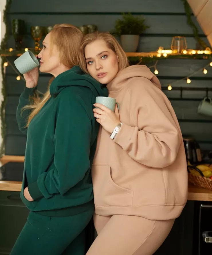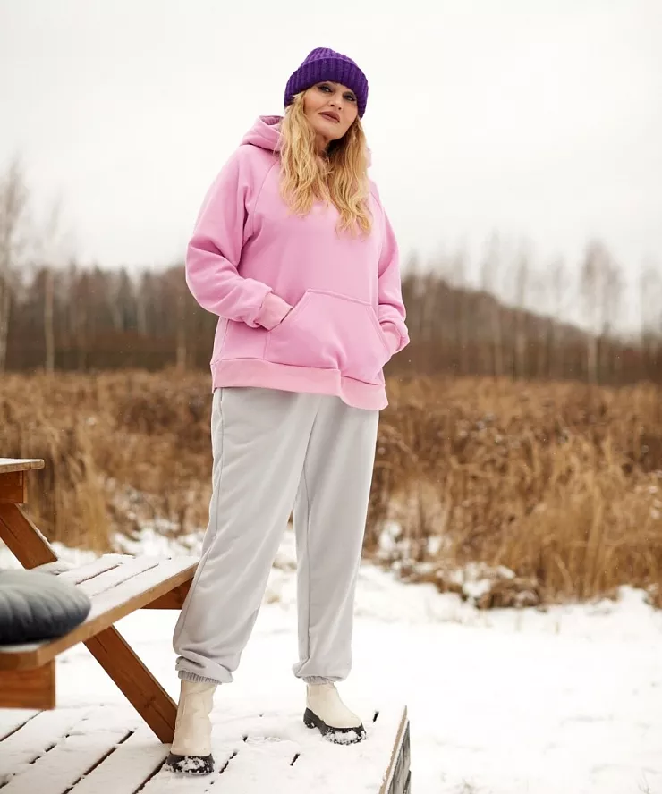 Чтобы сориентироваться в цветовой палитре, посмотрите фото моделей из нашего каталога. Если вы – яркая блондинка, то выбирайте нежно-розовый. Брюнетки оценят худи и джоггеры оптимистичных оттенков лаванды и слоновой кости.