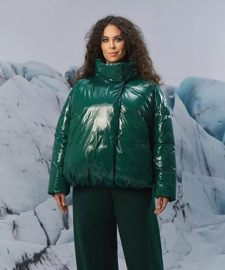 Зеленая дутая куртка пуховик с лаковым блеском