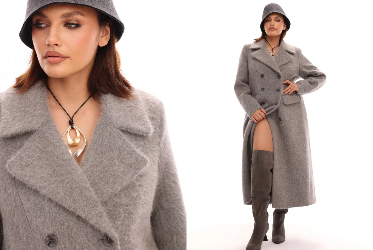 Серое двубортное шерстяное пальто с ворсом