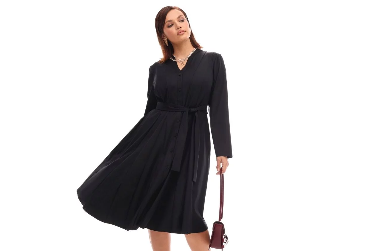 Черное приталенное платье на пуговицах из костюмной ткани