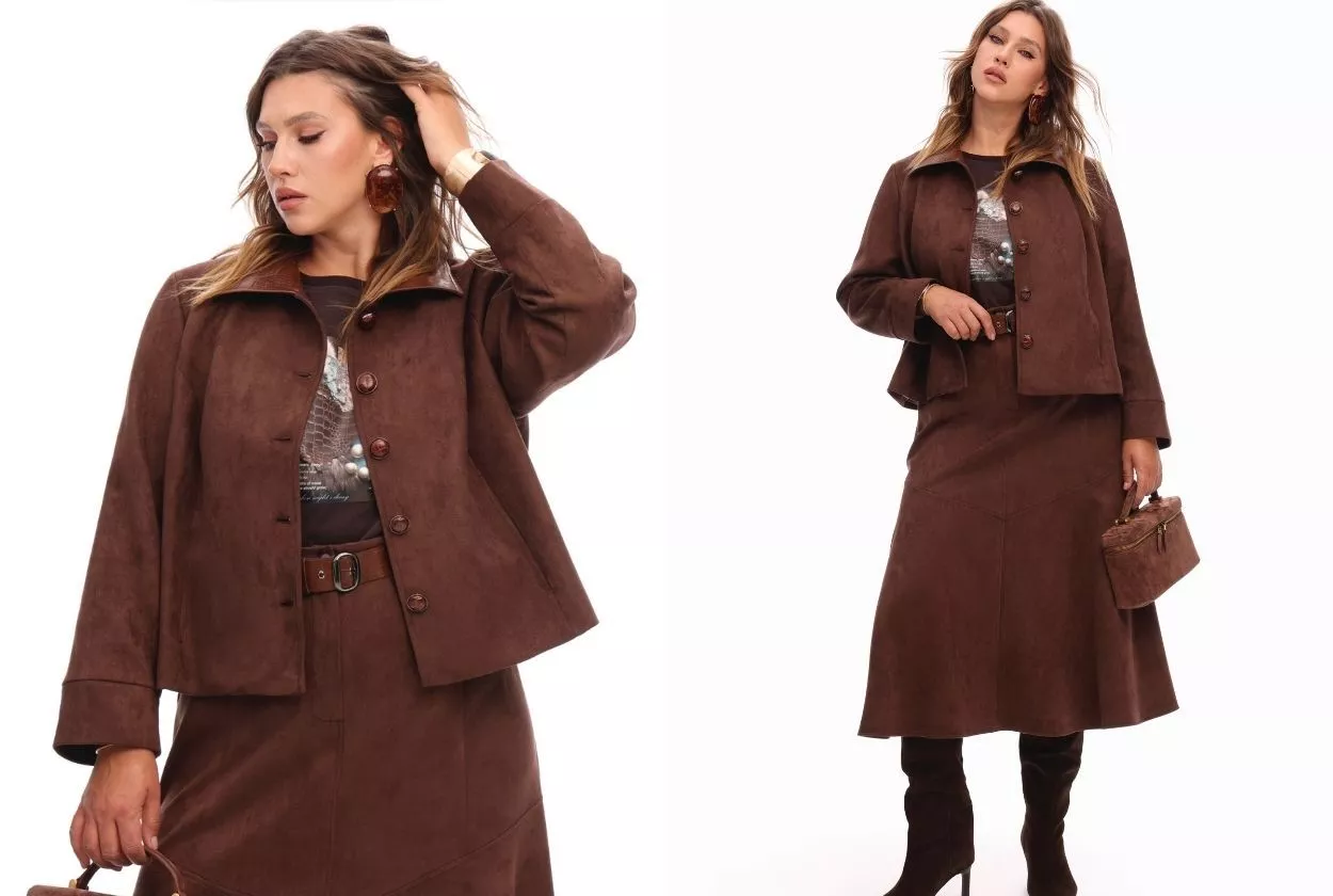 Костюм из экозамши с четкими линиями и мягким силуэтом — это узнаваемый силуэт, но не жесткость. Он гармонично смотрится и дополняет, не сковывает, а украшает свою хозяйку. Женственная юбка годе длины миди с легким воланом, расклешенная, как ветер — говорит о свободе выбора, о том, что женщина может быть одновременно точной и спонтанной. И жакет с акцентным воротником из фактурной экокожи — как символ завершенности и спокойствия даже в рамках такого сезона как зима.