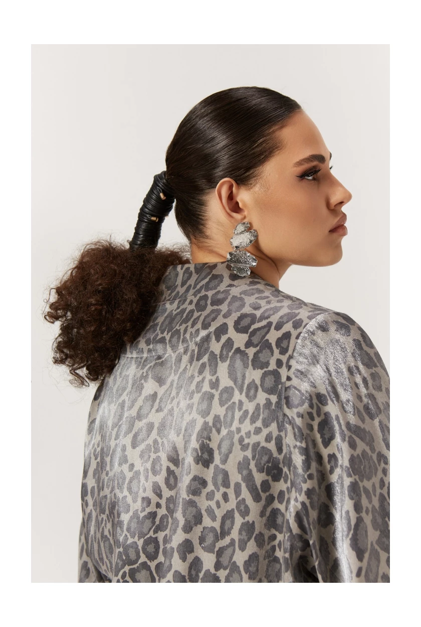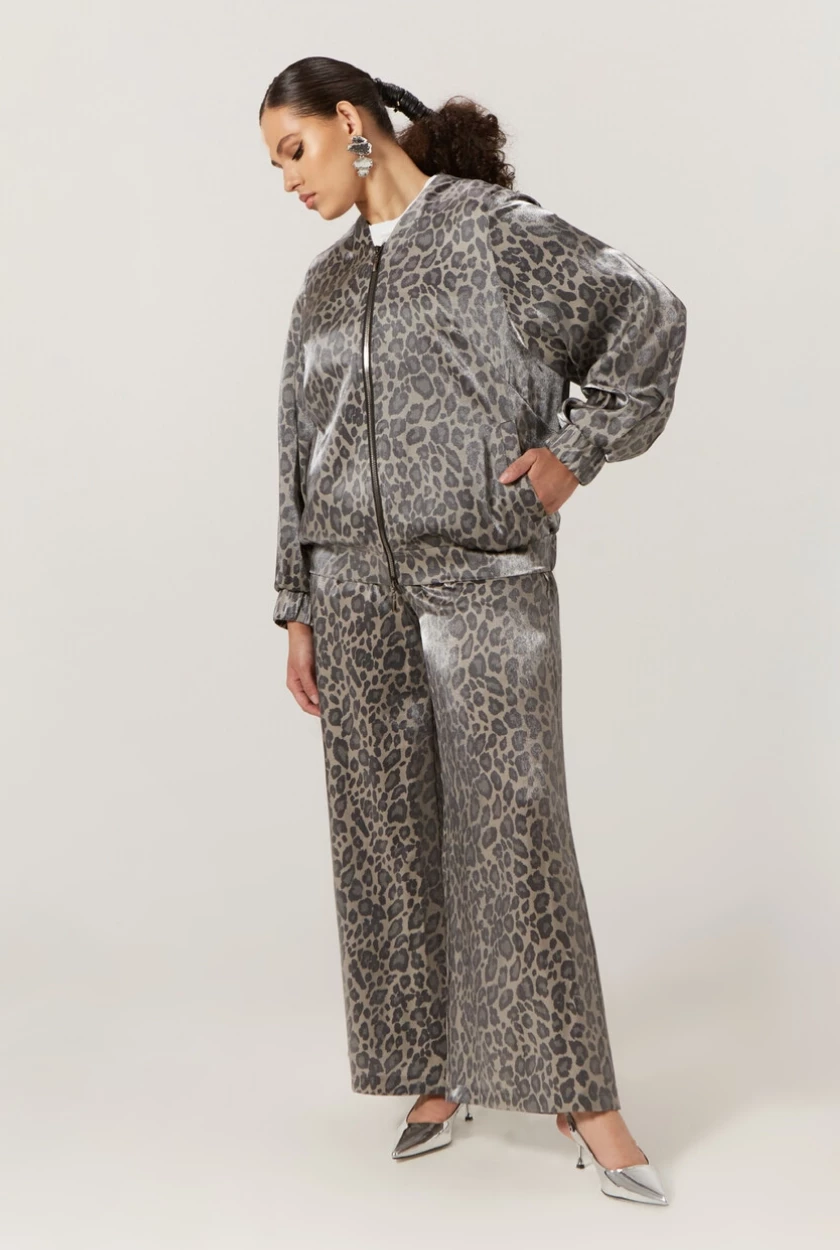Серый бомбер с принтом леопард и эффектом мокрого шелка