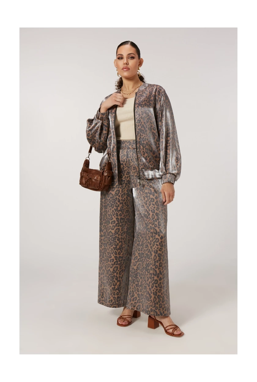 Серые палаццо с анималистичным принтом и эффектом мокрого шелка