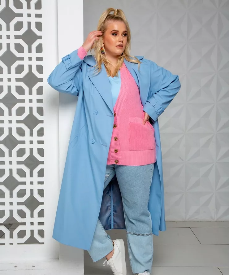 Голубой двубортный тренч на поясе