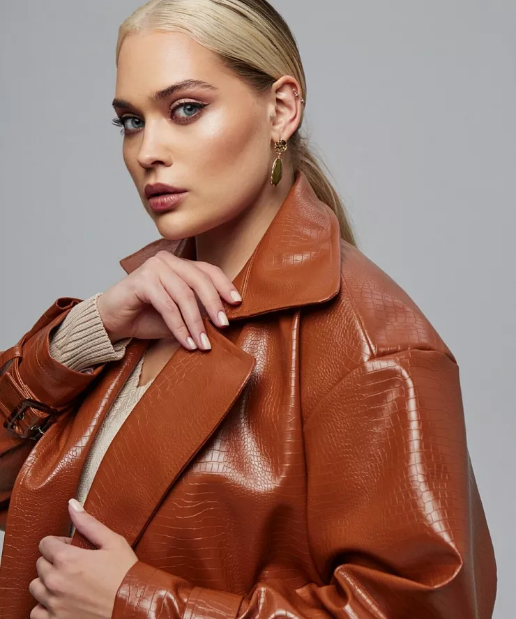 Двубортный тренч из лакированной экокожи с тиснением
