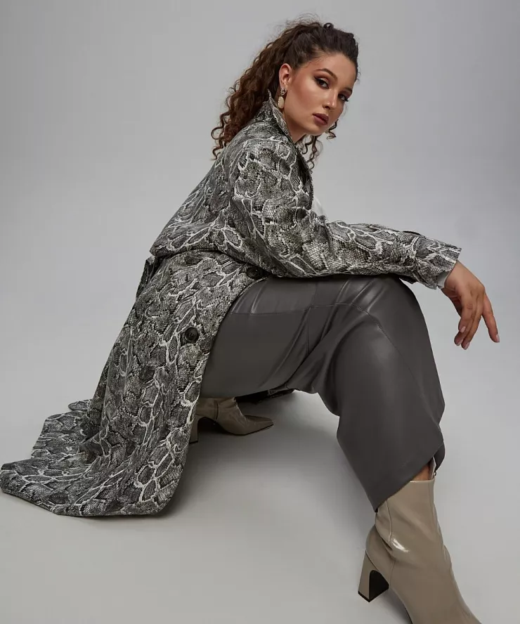 Двубортный тренч из экокожи принтованый в анималистичном стиле