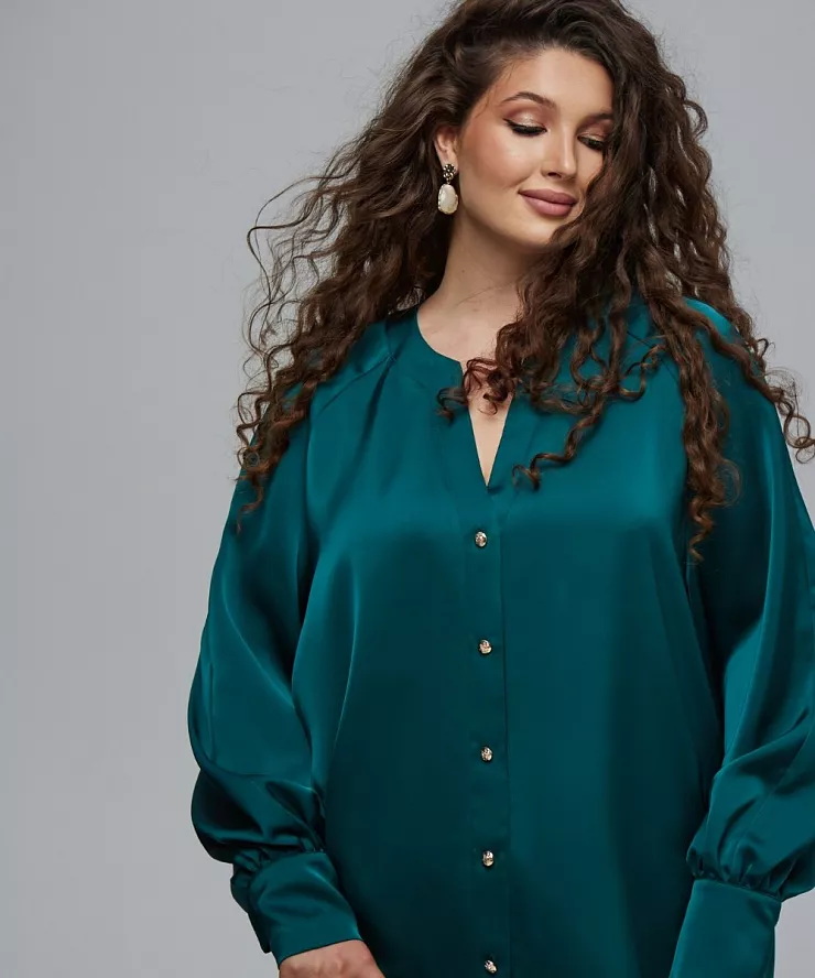 Шелковая рубашка оверсайз с v- вырезом и рукавом фонарик