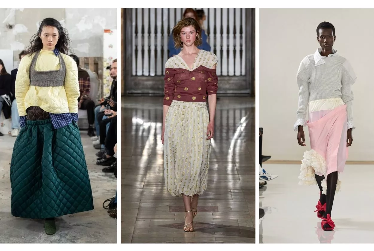 Линия плеча продолжает укреплять свои позиции. Это достигается не только за счет подплечников, но и благодаря крою реглан, объемным воротникам и конструктивным жакетам, напоминающим о эстетике 80-х, но в более мягкой и утонченной интерпретации. В противовес мощному верху, низ остается плавным и грациозным. В тренде брюки-клеш, начиная от бедра или колена, и юбки-макси в пол. Такой контраст создает динамичный и элегантный силуэт.