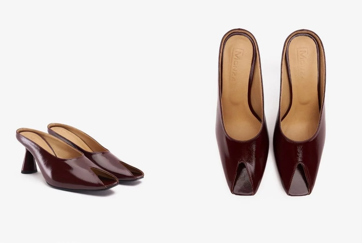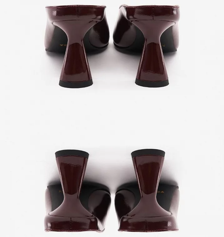 А вот и главная звезда для особых моментов. Мюли на устойчивом каблуке, с открытым мысом, выполненные из лаковой кожи насыщенного бордового оттенка. Они одновременно нарядные, удобные и немножечко дерзкие — но в рамках хорошего вкуса.