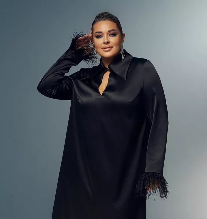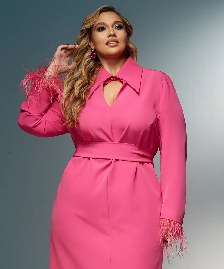 Розовое платье а-силуэта из костюмной ткани с перьями