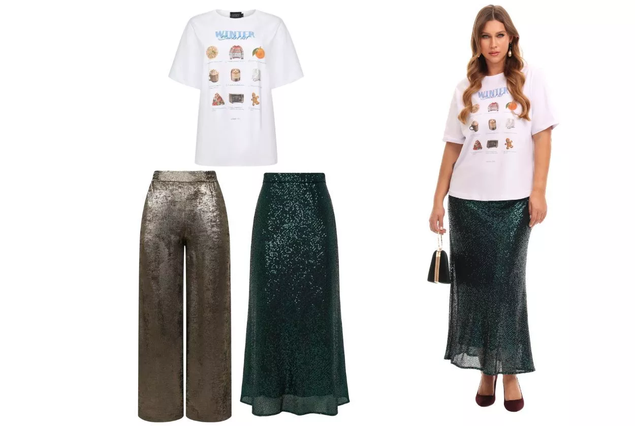 Идеальный образ: футболка + свободные палаццо. На случай, если соседи или друзья решат сделать сюрприз, можно быстро заменить штаны на юбку с пайетками.