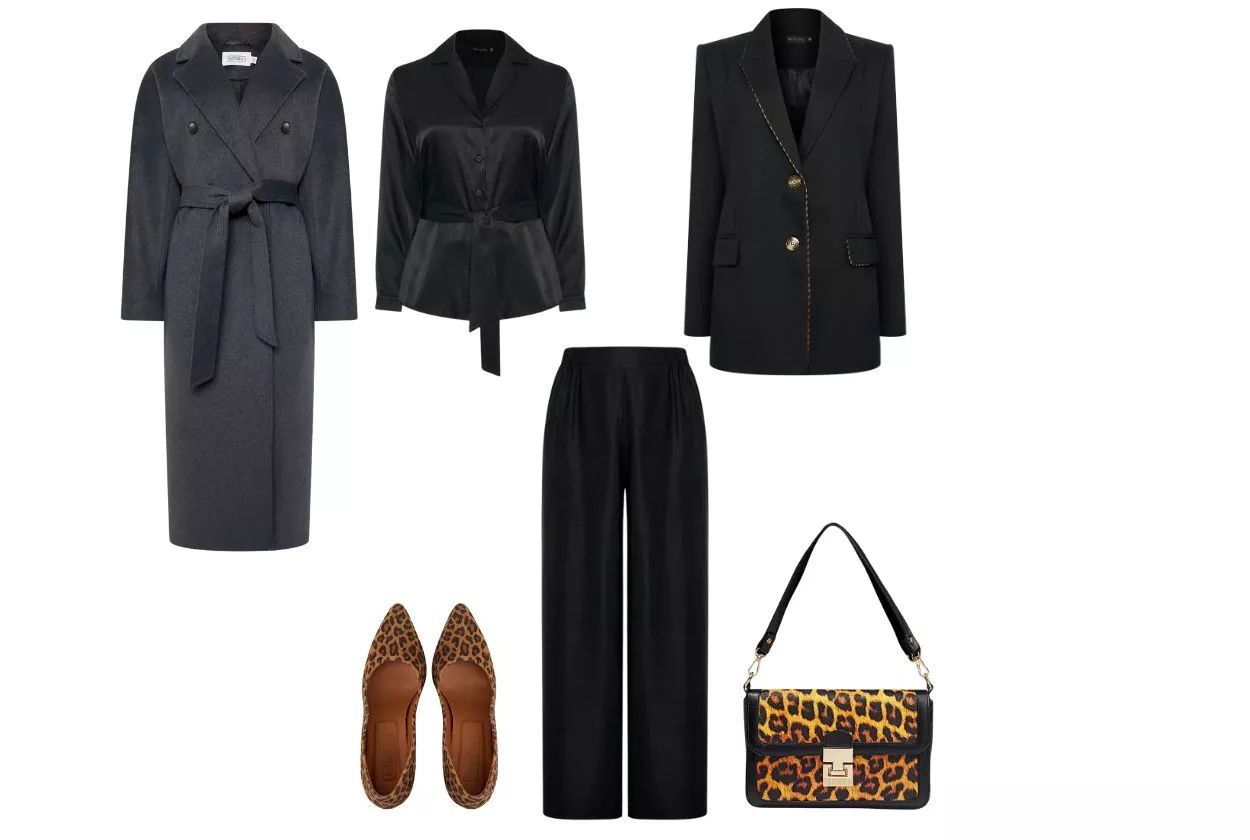 Классическая сторона: классические прямые брюки с четкими стрелками или палаццо, лодочки, сумка-портфель, массивные лаконичные аксессуары