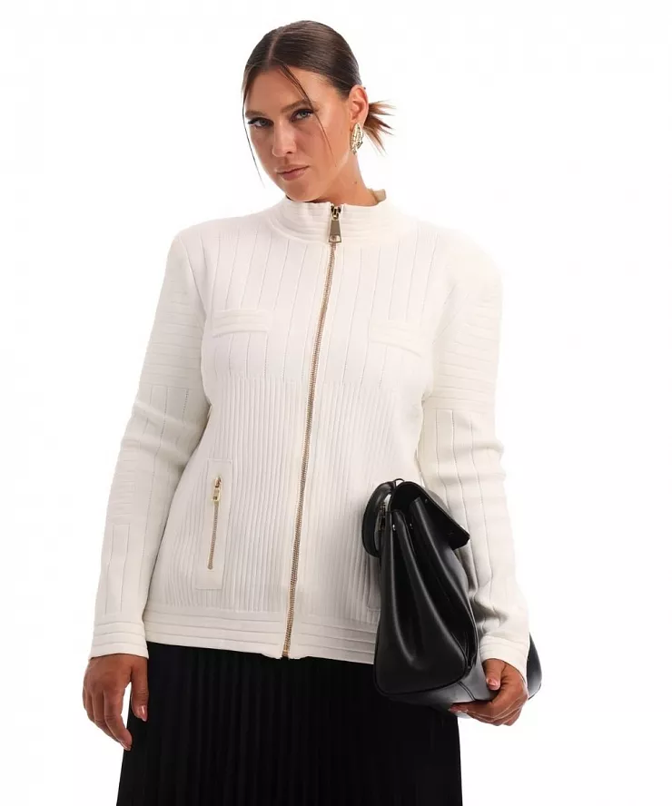 Белый трикотажный жакет с акцентными молниями и воротником стойка