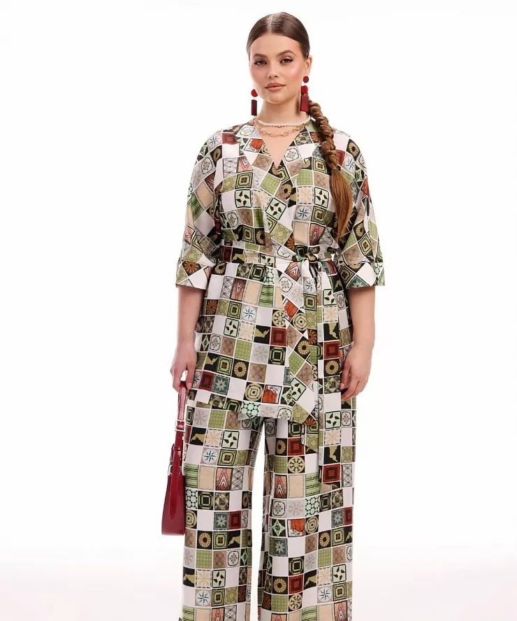 Брючный костюм с кимоно и принтом пэчворк