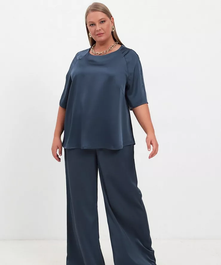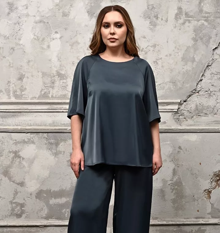Серо-зеленая блузка а-силуэта с округлой горловиной