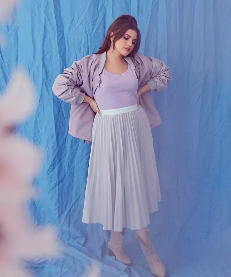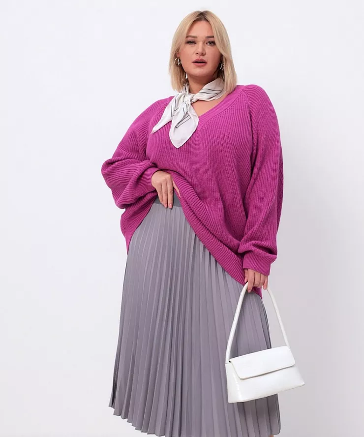 А вот другие вариации образов. В одном случае юбка плиссе приобретает теплый подтон благодаря сочетанию с ярким джемпером в цвете фуксия, в другом – юбка в цвете магнолия плавно переходит в сиреневую цветовую гамму.