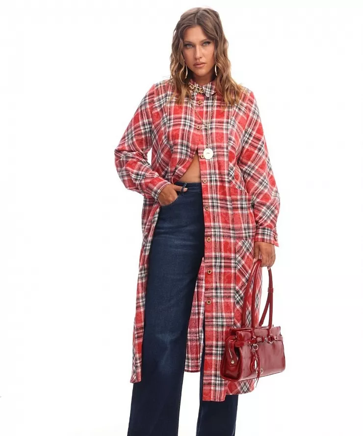 Повседневный образ: Джинсы + красное платье-рубашка — простой и стильный образ для прогулок по городу или встреч с друзьями.
