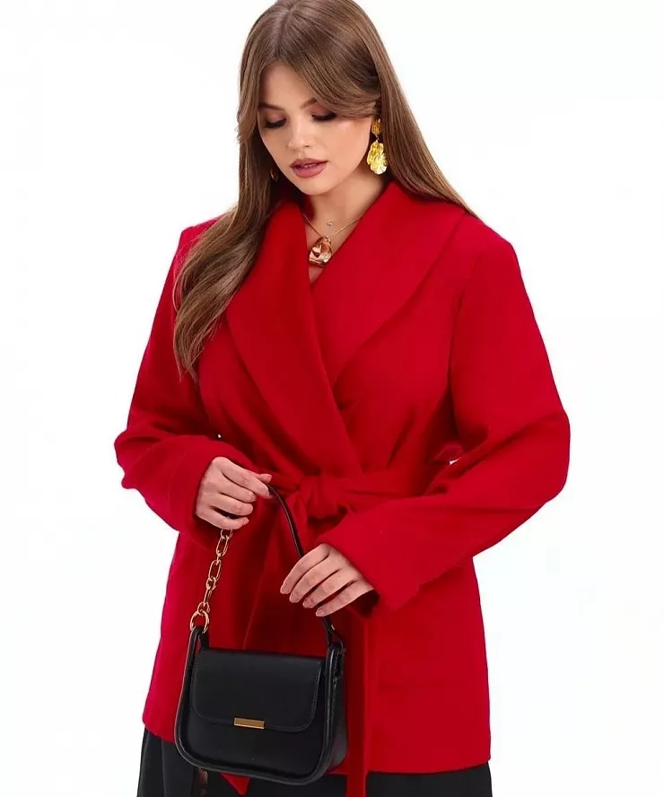 Красное полупальто с запа́хом из смесовой шерсти