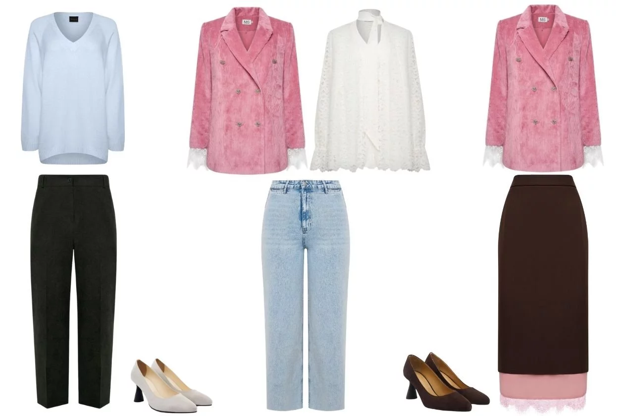 50+: моно-образ или жакет + строгие линии. Главное — не перегружать верх. Спокойный трикотаж, жемчуг, минимализм. Вельвет дает фактуру, а ваша задача — дать ей прозвучать.