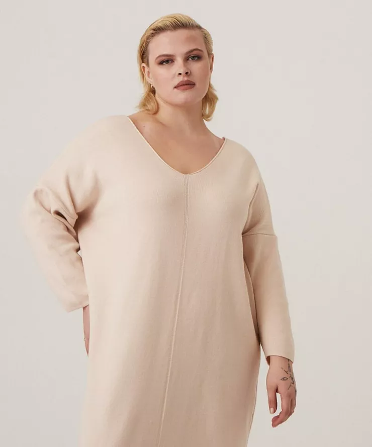 Бежевое платье свитер из вязаного трикотажа с добавлением кашемира