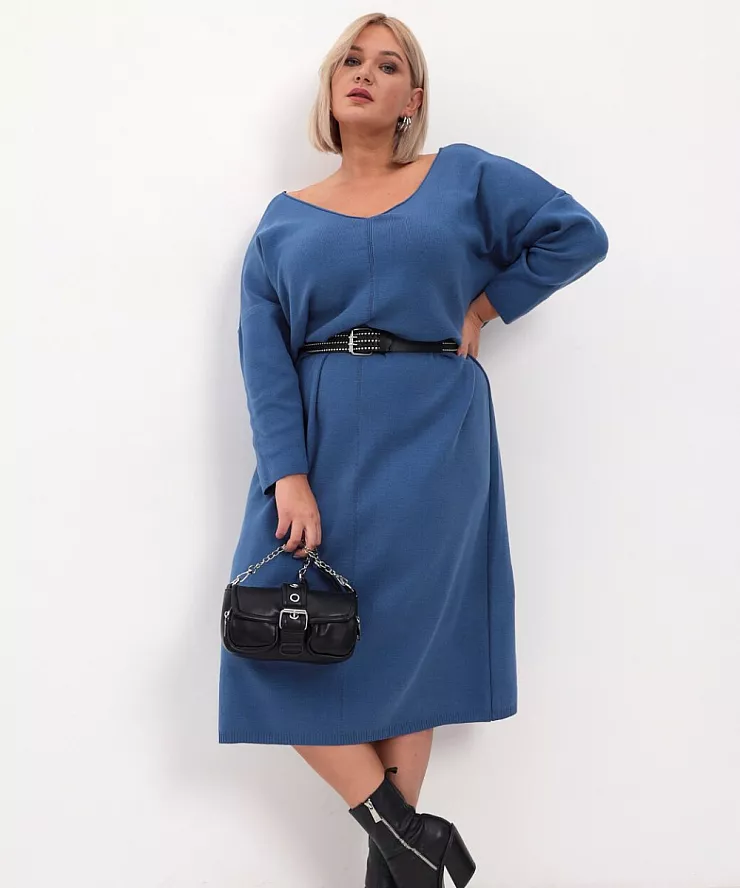 Синее платье свитер с треугольным вырезом из вязаного трикотажа