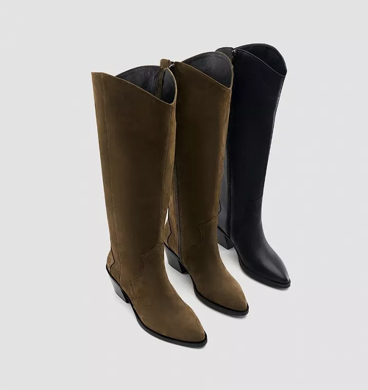 Еще одни ходовые новинки – казаки из натуральной кожи и нубука. Подойдут для сухой и пасмурной погоды. Узнаваемый фасон с заостренным мысом и скошенным устойчивым каблуком, высокое и широкое голенище дают возможность долгое время находиться на ногах и не уставать. Голенище позволит выбирать любые брюки и, при необходимости, легко их заправить. Особенности: увеличенная полнота и ширина голенища, стелька из текстиля, застежка молния, материал подошвы ТЭП (который представляет собой смесь на основе каучука и термопластов, хорошо держит тепло, не скользит на снегу).