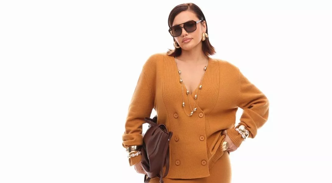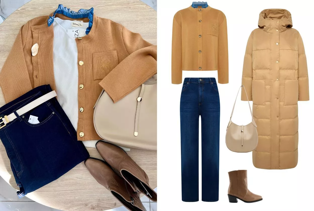 Кардиган и джинсы — это классическая комбинация, которая идеально подходит для холодного сезона. Кардиган-жакет из смесовой шерсти будет отличным вариантом для создания теплого и уютного образа. Песочный оттенок напомнит о теплом времени года и красиво подчеркнет овал лица. К нему можно подобрать разные оттенками джинсов, мы остановили выбор на классике темно-синего цвета