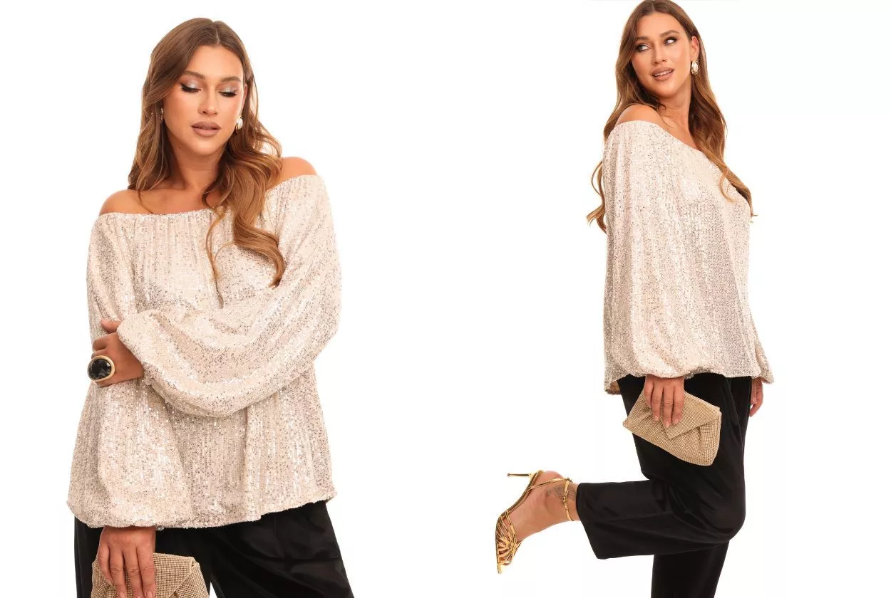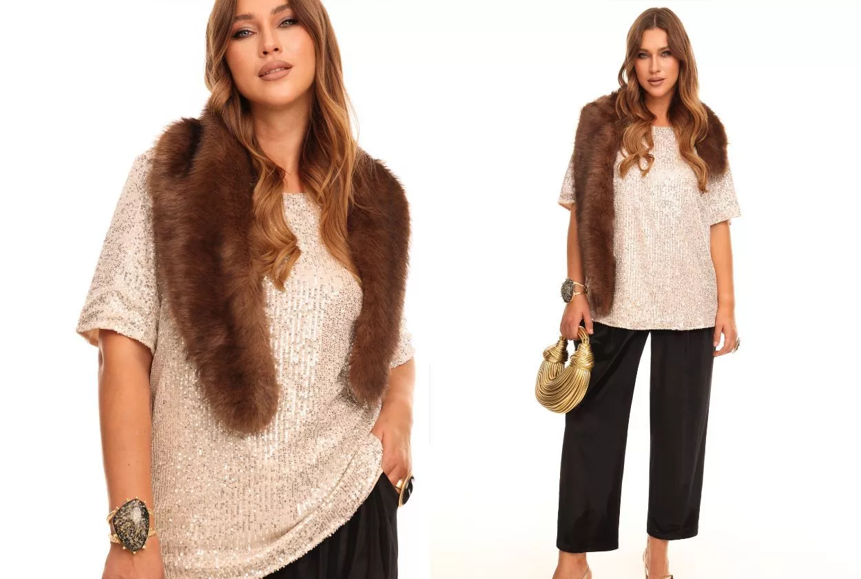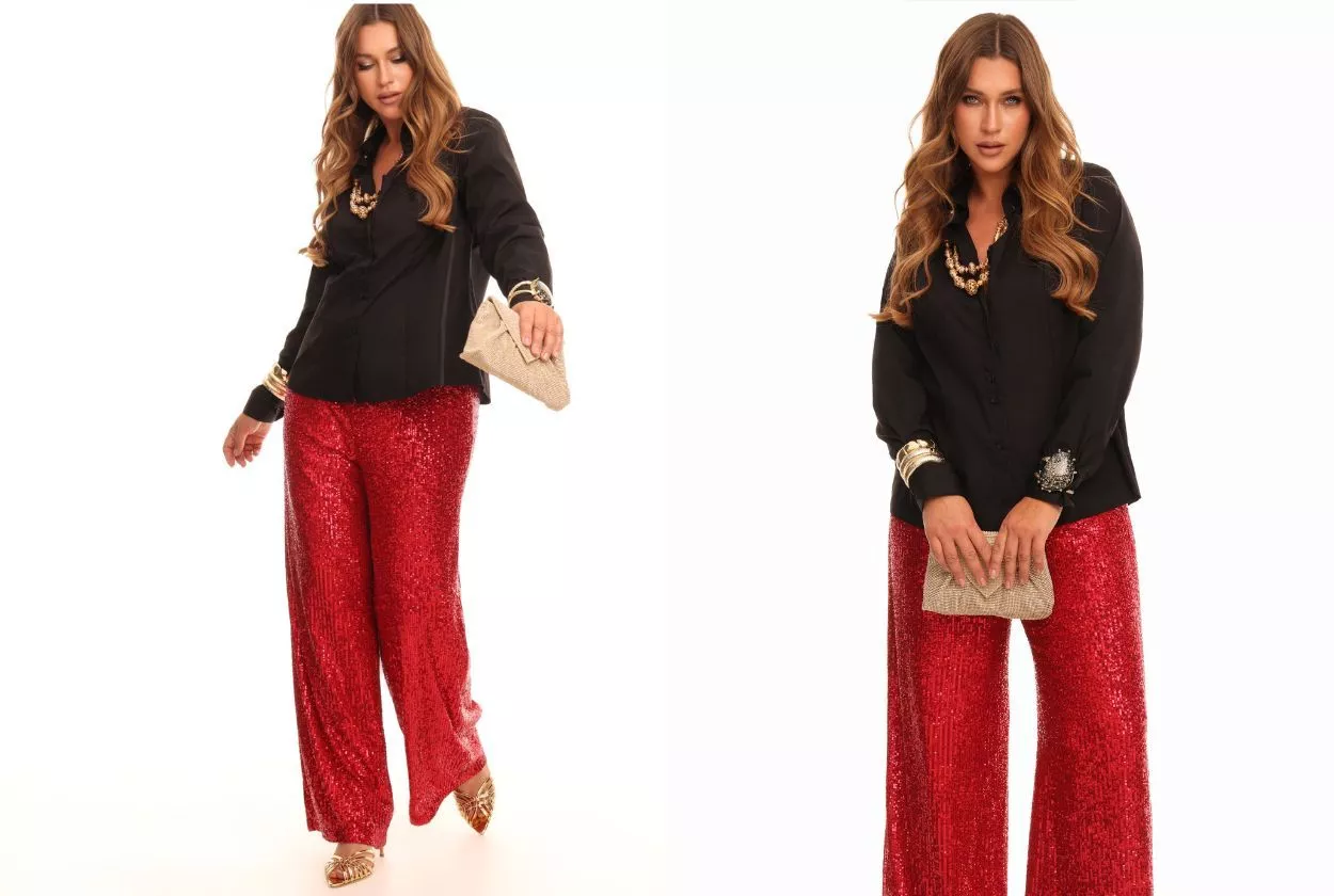 - Пайетковые брюки-палаццо, оживляющие образ.