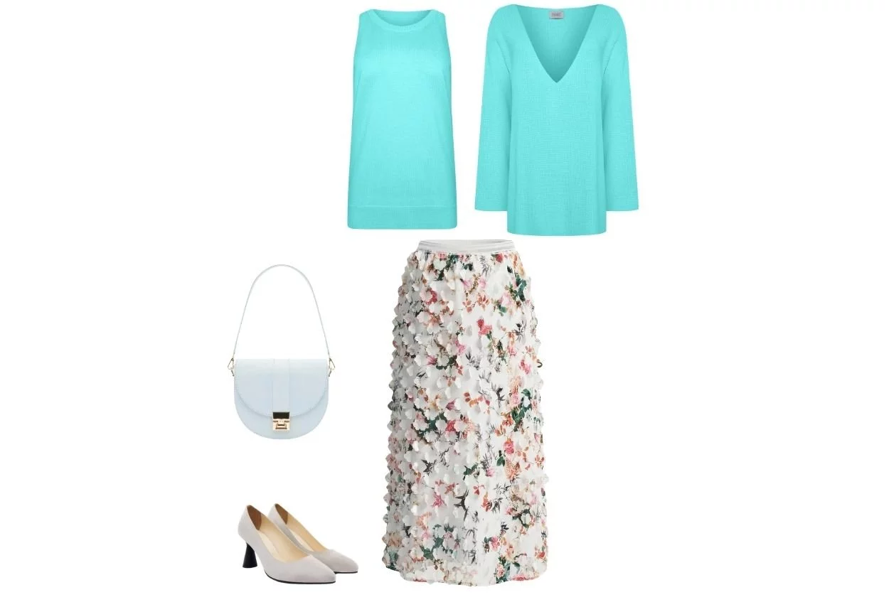 Идеальный весенний микс. Голубой и молочный создают ощущение чистоты, а лаймовый дает энергию и бодрость. Черное кружево на новом топе придаст небольшую изюминку образу.