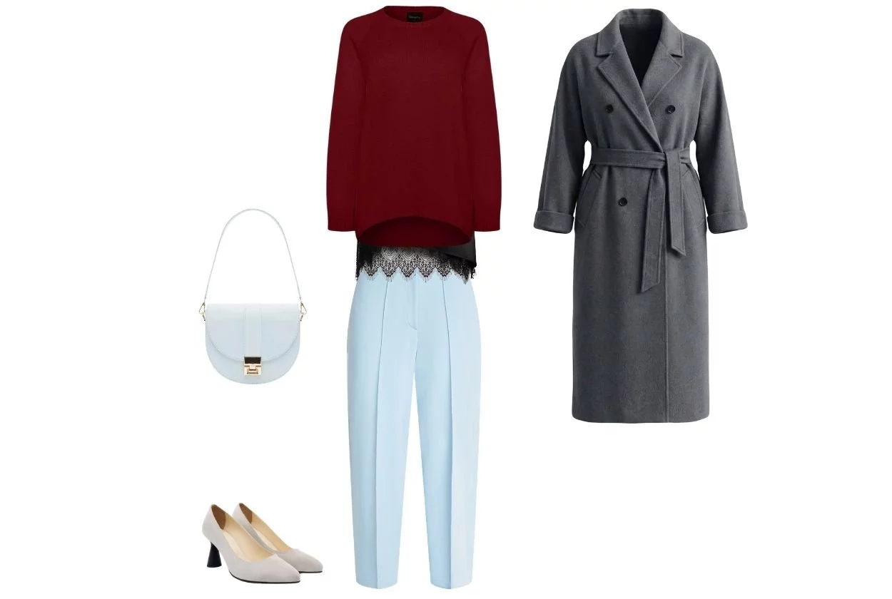 Как собрать: джемпер винного цвета + черный топ с кружевом + голубые брюки. Сверху — пальто в графите. Акцент — аккуратная сумочка небесно-голубого цвета или шелковый платок, повязанный на шею или ручку сумки.