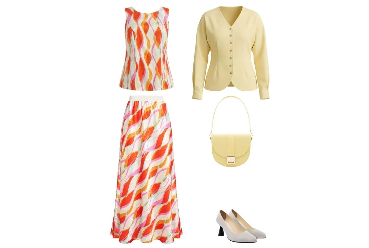 Как собрать: юбка с принтом из новой коллекции + двухслойный джемпер из прошлого дропа + сумка через плечо в сочном оттенке.