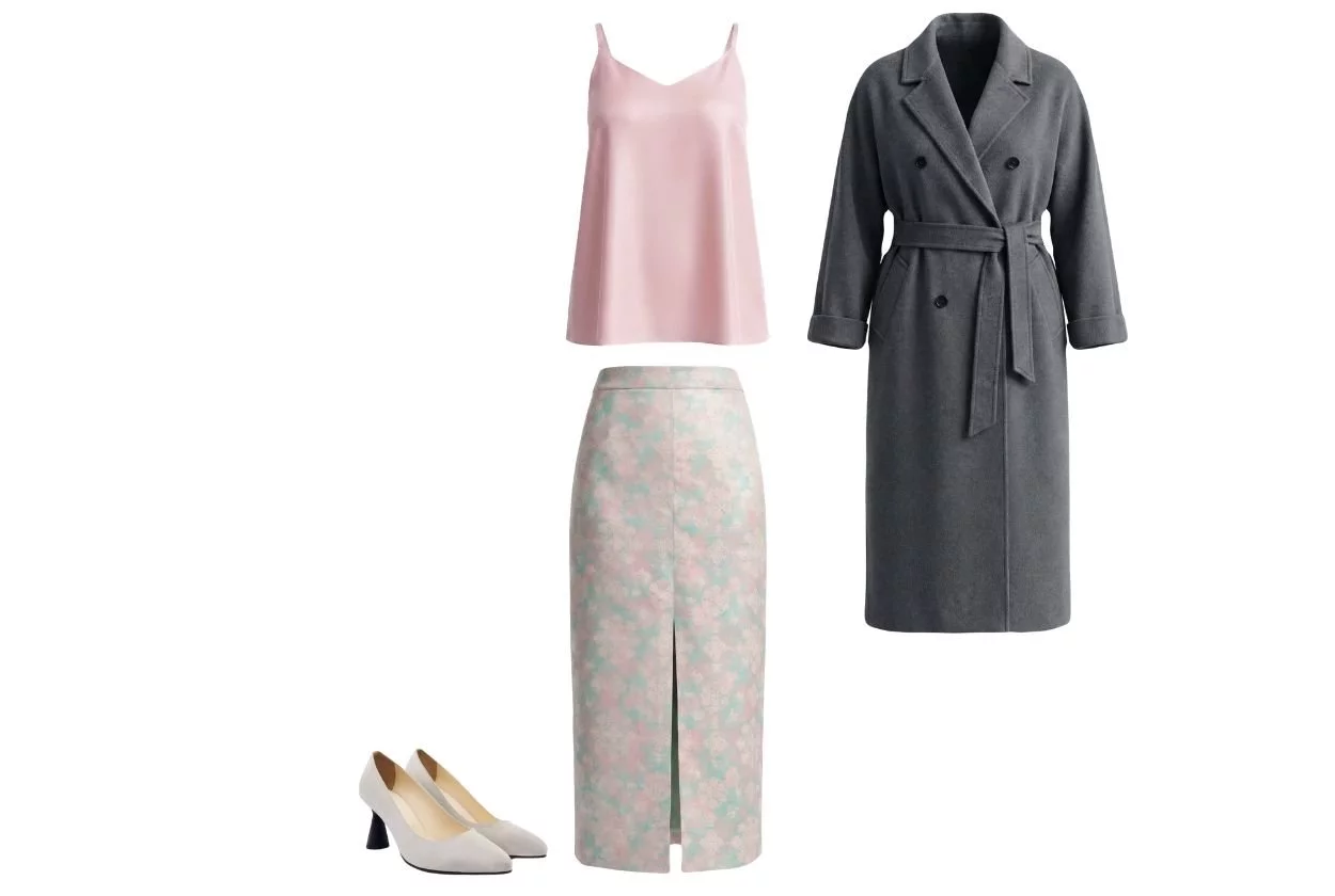 Как собрать: пальто из шерсти в макси длине + юбка из жаккарда + топ в жемчужно-розовом цвете. Это настоящая магия цвета. Цветок, который существует лишь благодаря вам.